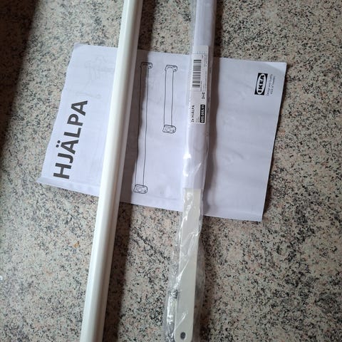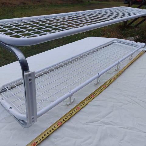 Kaksi tankoa + kannattimet. Molemmissa hengarien tekemää kulumaa, muutoin siistit. Leveys 46 cm