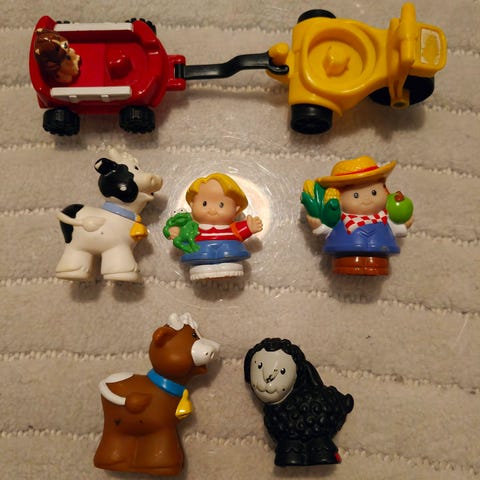 Fisher Price Little People autokorjaamo & hahmot. Vanhempia leluja pääasiassa 2000-luvun alusta. Hyväkuntoisia leikeissä olleita, osassa paikoin selvempää maalikulumaa.