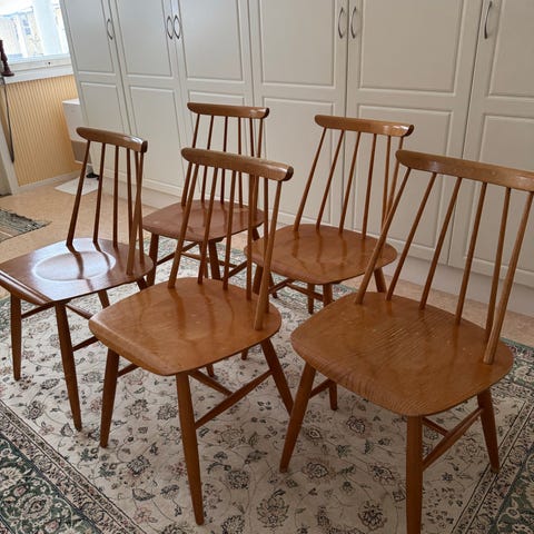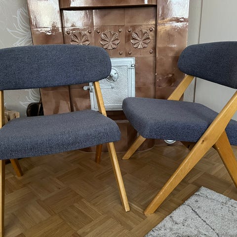 Hyvässä käyttökunnossa olevat 50-luvun tuolit. Uudelleen verhoiltu vanhan päälle.