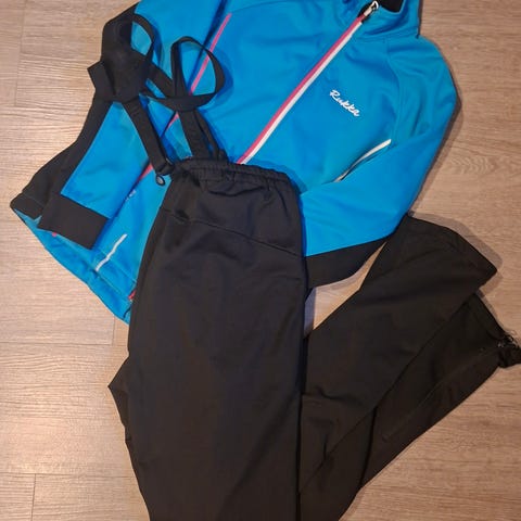 Rukka-hiihtopuku. Materiaali softshelliä. Takki on sininen mustilla ja valkoisilla yksityiskohdilla. Housut ovat mustat. Kunto on erittäin hyvä. Ei ole kulumia tai rikkinäisiä kohtia ja vetoketjut ovat ehjät. Koko on naisten S/36.