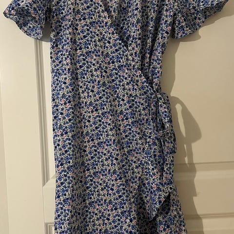 Modströmin vaaleanpunainen kuviollinen kietaisumekko. Kiinnitys napilla ja nepparilla, lisäksi on vyö mekon kankaasta. Materiaali kevyttä viskoosia, samoin vuori. Pari pientä tahraa, joista kuvat lopussa.