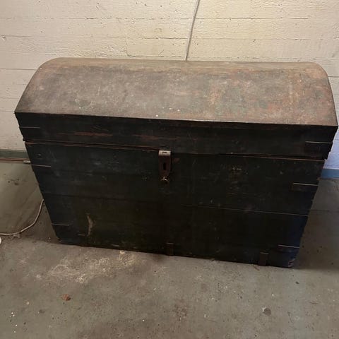 Vanha arkku jonka korkeus 88, leveys 67 ja syvyys 65. Soveltuu tasakantisena vaikka olohuoneen pöydäksi