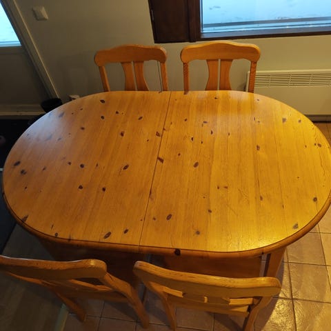 Suorakaidepöytä (jaloissa koristeleikkaukset)mitat 80×50cm ja tuolit h:95€, pehmustetut koivutuolit h:70€, pyöreä pöytä 80cm h:30€,rahi l.100,k.45.s45 ,30€