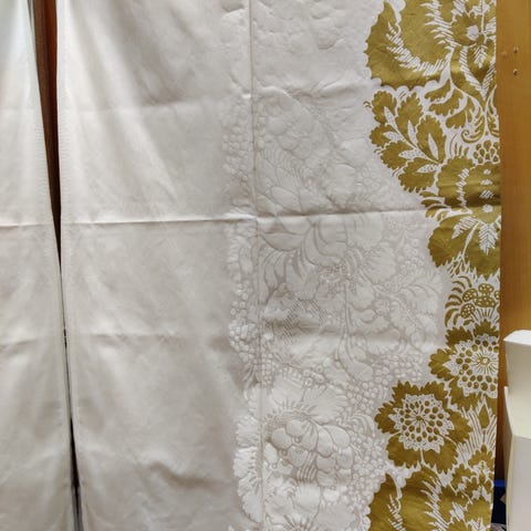 Vielä käyttökelpoinen Marimekon Ananas kuvoilla, sinapinkeltainen. Pieniä tahroja jotka varmaan pesussa lähtevät. Koko 127 x 166.