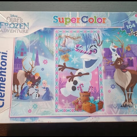 104 palainen Frozen palapeli, kaikki palat tallessa. Laatikossa saattaa olla jotain käytönjälkeä, palat hyvässä kunnossa.