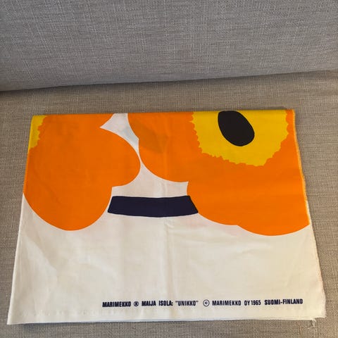 Käyttämätön, Marimekon Unikkoa. Design Maija Isola. Pituus 148 cm, leveys 147 cm. Kankaassa Unikko-kuosi jatkuu reunoihin asti. Tässä ei ole niitä reunapainatuksia jossa Marimekko-teksti. Materiaali 100% puuvillaa.