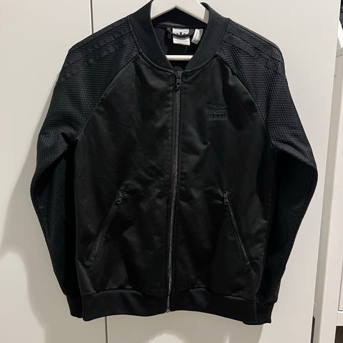 Adidaksen ihana musta vajaamittainen verkkatakki koko S. Pinta kiiltävä musta, näyttää kuin olisi nahkaa. Vetoketjun vetimenä aivan ihana kruunu ja selässä tummilla koristekivillä tehty printti, jossa adidaksen logo, kruunu sekä teksti ”respect me”. Edessä avonaiset etutaskut. Korkea kaulus. Hihansuissa ja vyötärön kohdalla olevassa resorissa kultaisen väriset napit, joissa adidaksen logo. Vyötärön resorin ansiosta korostaa ihanasti vyötäröä. Siisti kunto.