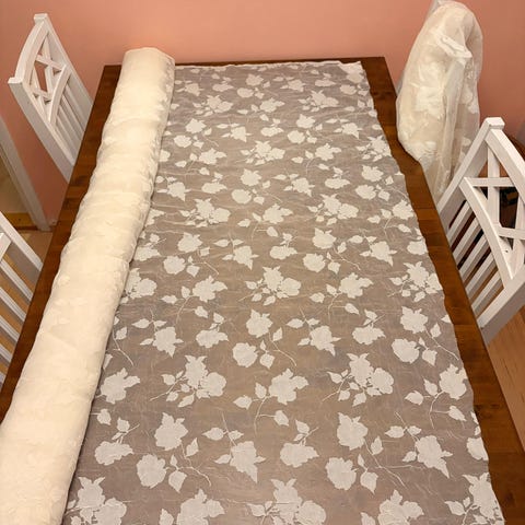 Verhojen leveydet ovat 70, 130 ja 49 cm. Ne eivät liu oikein hyvin noilla pidikkeillään, niin ovat aina vaan roikkuneet ikkunan edessä. Niistä ehkä kannattaisi tehdä kapat ja sitten vaikka tyynynpäällisiä loppukankaasta. Ihan vaan ideana. Kangas on napakkaa puuvillaa.