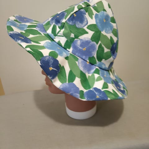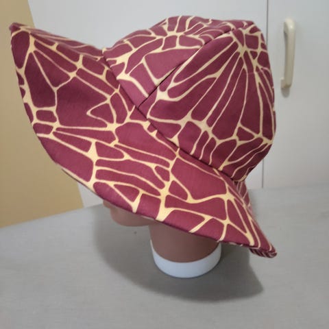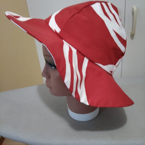 Vuorellinen (puuvillaa) hattu. Lierin leveys 8 cm. Koko 59 cm.
