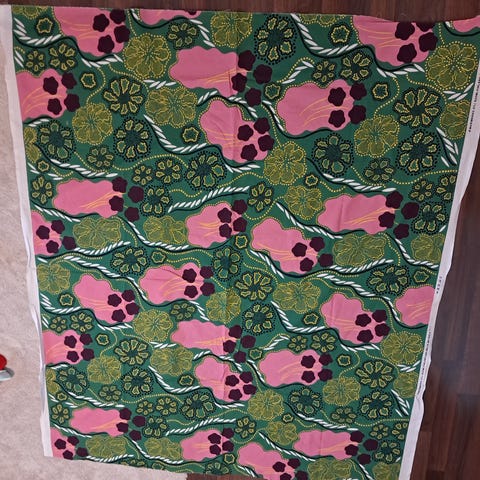 Marimekon siisti, käyttämätön kangaspala Heila. Marimekolla Helsingissä painettu Heila kangas on 100% puuvillaa. Kangas on Erja Hirven vuonna 2007 suunnittelema. Kankaan leveys on 145 cm ja pituus 240 cm. Kankaan molemmissa pitkissä sivuissa on ompelukoneella ommeltu 1 cm käänne. Kankaan toisessa lyhyessä sivussa on 10 cm päärme ja toinen lyhyt sivu on kokonaan ompelematon.