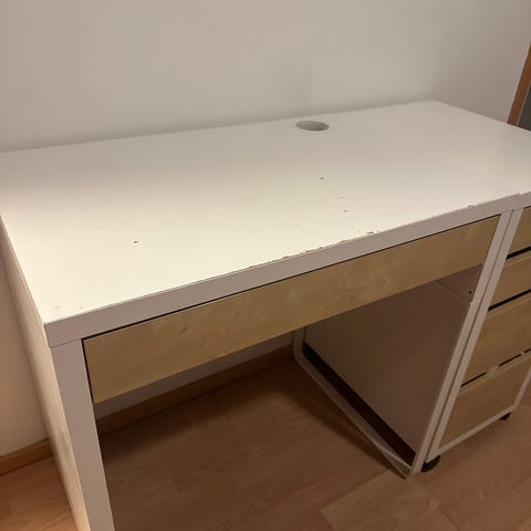 Kaksi valkoista ikean työ/koulupöytää. Toinen täysin priimassa kunnossa, toisessa jälkiä pinnassa. Myydään settinä. Viimeinen kuva toisen pöydän huonommasta pinnasta.