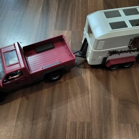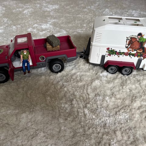 Schleich sarjan hevostenkuljetustraileri ja auto setti. Kokonaan ehjä. Kaikki settiin kuuluvat alkuperäiset pikkuosat tallessa! Mukana Rambon tallista tuttu hoitaja Iisa, kuski Jarmo, vanhanmalliset satula ja suitset sekä iso joukko muita hoitotarvikkeita. Mukaan löytyy myös alkuperäinen laatikko ja ohjekirja. Nouto Ritaharjusta