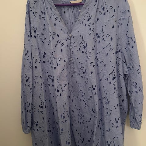 Vihreä kuviollinen viskoosi tunika. Ohutta laskeutuvaa kangasta. Pitkät hihat, hihan suussa kuminauha. Koko 50/52.