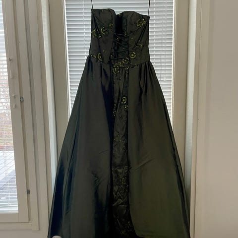 Myydään kaunis turkoosi olkaimeton iltapuku/vanhojentanssimekko. Kangas on vahvaa ja mekko laadukkaan oloinen. Edessä on koristeita ja takana nyöritys. Mekko on ollut noin 160-senttisellä matalahkoilla koroilla. Koko ehkä noin S, mutta nyöritys antaa mukavasti jouston varaa. Nyörityksen loppuosassa ja toisessa nyörissä on purkauma (kuvat) ja joitakin langanpätkiä löytyy. Mekko on juuri pesty käsin (kuvien oton jälkeen).