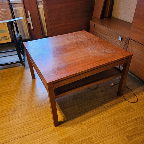 Hakusanat: vintage, vanha pöytä, sivupöytä, sohvapöytä, pyöreä pöytä, 1940-luku, 1950-luku, retro, puupöytä, viilupöytä, skandinaavinen, skandi, antiikki, sisustus