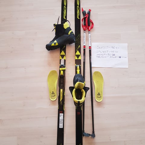sukset, sauvat, monot. koulusuksina olleet vähän naarmuja pohjissa. monot 40 mutta pieni koko. sunnuntaisin kulkeutuu seinäjoelle.