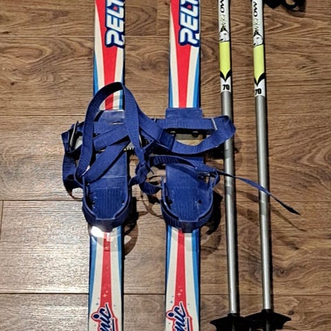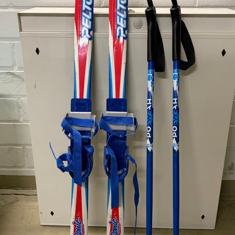 Hyväkuntoinen setti: sukset 100cm ja sauvat 75cm. Sopii noin 100cm lapselle. Näillä ei ole montaa metriä hiihdetty, uutena ostettu.