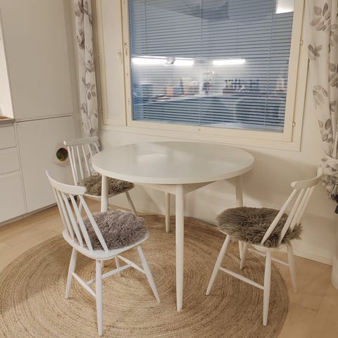 Mukana kolme tuolia, ja lisäksi pöydän kanssa voi halutessa tulla kaksi puista tuolia.