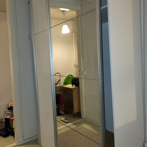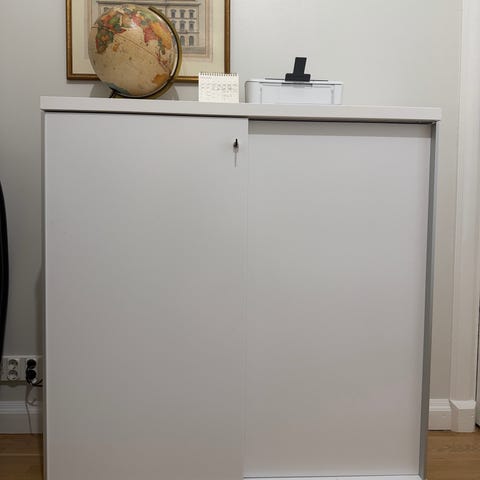 Kohtuu siisti Martela liukuovikaappi, erittäin tukeva. Viat ovat toisen oven alaosassa oleva pieni halkeama (voinee liimata, eikä haittaa käyttöä), sekä kannessa olevat neljä reikää, ilmeisesti hylly ollut päällä kiinni. Liukuovet toimivat hyvin, samoin lukko. Sisäosat siistit