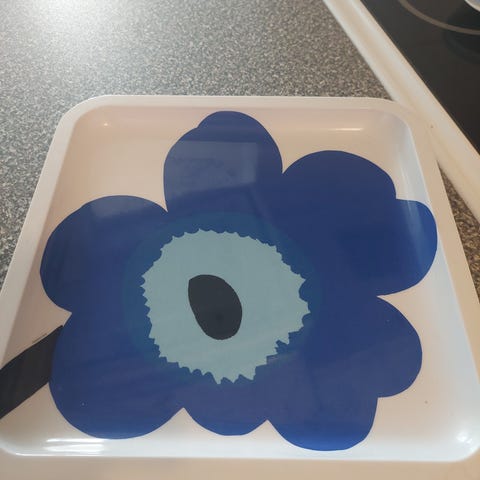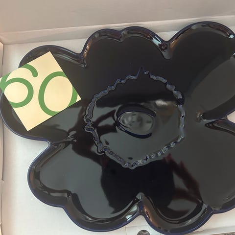 Unikko-kukan mallinen tarjoilulautanen on valmistettu valkoisesta keramiikasta. Käyttämätön.
