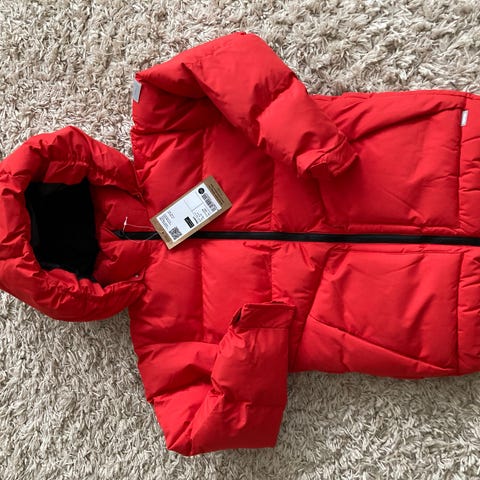 Takki vastaa kokoa isompaa. On jo kolmas saman mallin takki meillä ja aina ollut ”kokoa pienempänä”. Takkia käytetty joitakin kertoja. Toisen taskun kohdalla tahraa, mutta en tämän vuoksi lähtisi takkia pesemään.