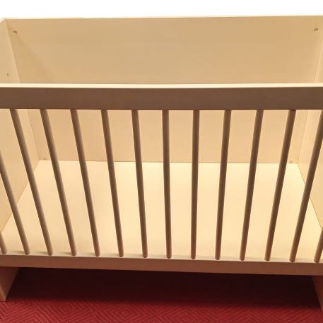Pinnasänkyyn on vauva laita sekä kuvassa näkyvä taapero laita. Sängyssä on käytönjälkiä.