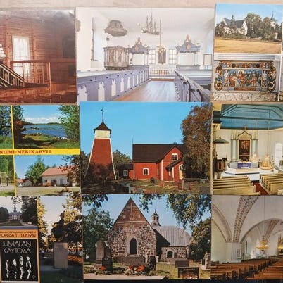 Postikortteja aiheena kirkot, ulkoa ja sisältä