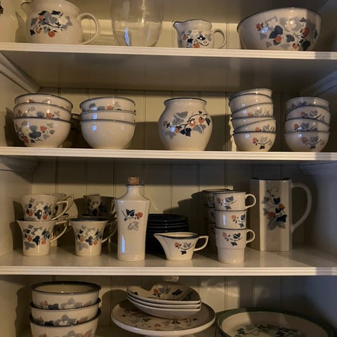 Sisältää kakkulautasen, säilytyspurkin, kermakon, sokerikon, neljä kahvikuppia ja kaksi lautasta.