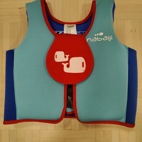 Decathlonin lasten Nabaiji-uimaharjoitteluliivi. 15–18-kiloiselle lapselle. Rinnanympärys max 55 cm ja lapsen maksimipituus 105 cm. Ei pelastusliivit, vaan uimaharjoitteluun tarkoitetut liivit.