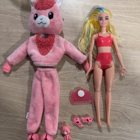 Kuvan mukainen nukke. Hyvässä leikityssä kunnossa. Osa omista alkuperäisistä tavaroista on hävinnyt leikin tiimellyksessä ja osa paketissa tulevista saattaa kuulua alunperin johonkin toiseen settiin.