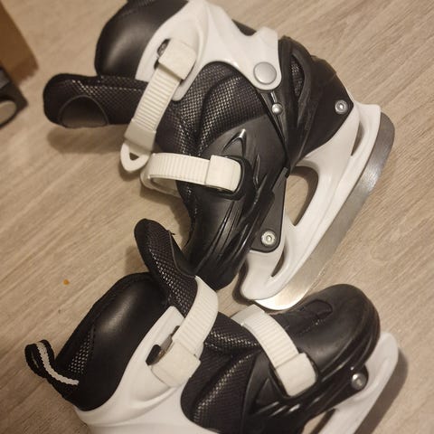 Lasten luistimet mustavalkoisella värityksellä, säädettävä koko 30-33. Luistimissa on tukeva rakenne ja kaksi kiinnityshihnaa, jotka tarjoavat lisätukea ja turvallisuutta käytön aikana.