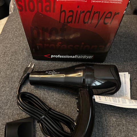 Vaaleansininen pieni hiustenkuivain. Kätevä esimerkiksi matkalla. Korkeus noin 19 cm.