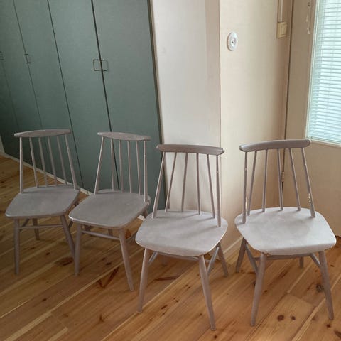 5kpl Fanett-tuoleja arviolta vuodelta -30. Tuoleista löytyy lyijykynämerkinnät.