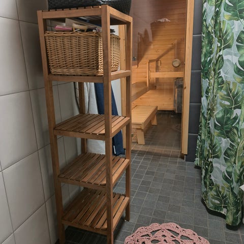 Hyväkuntoinen ja siisti puinen hylly vaikkapa kylpyhuoneeseen tai kukkahyllyksi.