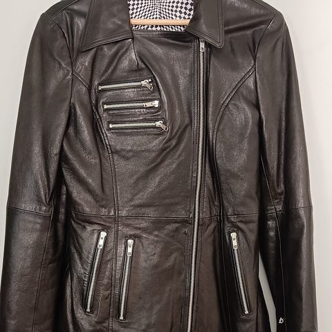 Saki todella hyväkuntoinen, pari kertaa pidetty tummanruskea nahkatakki.