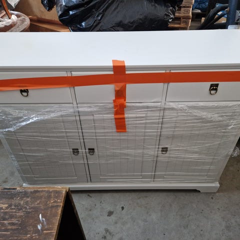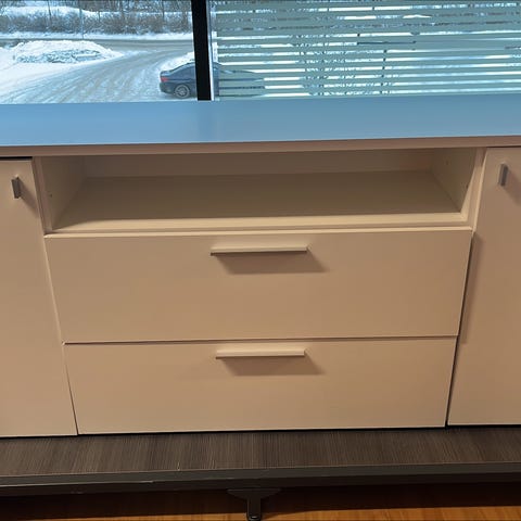 Senkki, jossa on kolme ylälaatikkoa ja kuusi alakaappia. Väri on valkoinen ja musta, ja vetimet ovat metalliset.