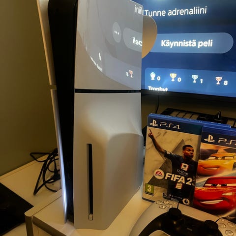 Playstation 5 pelikonsoli. Sisältää ohjaimen, tarvittavat kaapelit ja konsolille tuen.