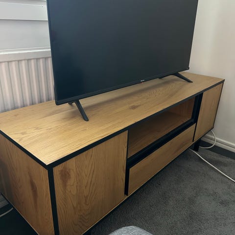 Jysk DOKKEDAL TV-taso, jossa harmaa taso ja musta metallirunko. Mitat 120x40 cm. Sopii televisiotasona tai säilytystasona olohuoneeseen tai muuhun tilaan.