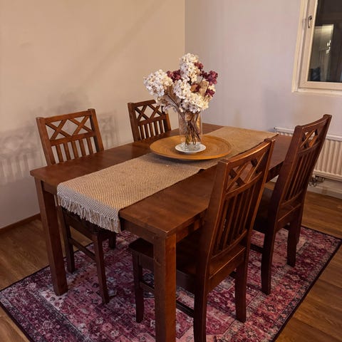 Myydään täyspuinen punertavan ruskea ruokapöytä sekä siihen kuuluvat 2 tuolia. Pöydässä on muutamia haaleampia kohtia, kulunut käytössä todennäköisesti.
