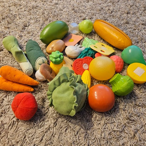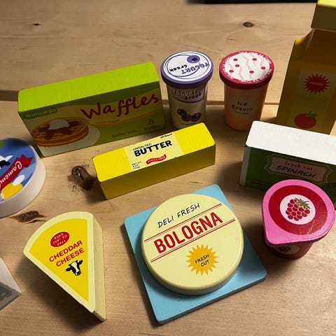 Puusta tehtyjä leikkiruokia.