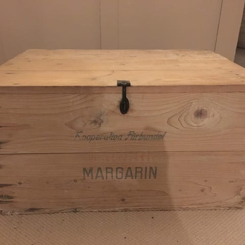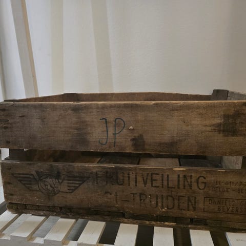 Vanha kasvienkeräyslaatikko, vaneria,nahkahihna ja -solki