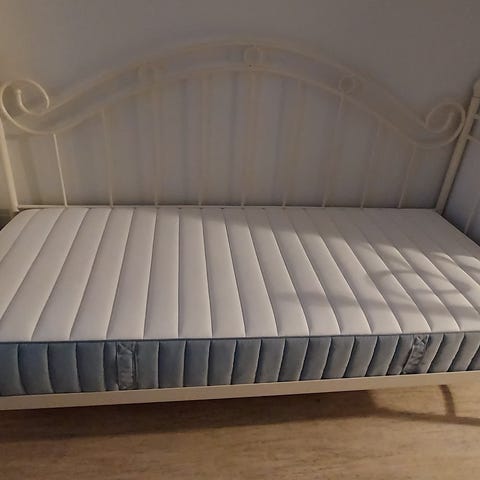 Valkoinen Ellos metallirunkosänky ja Ikea Malfors patja