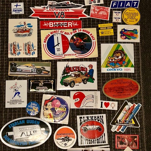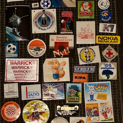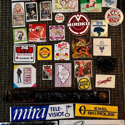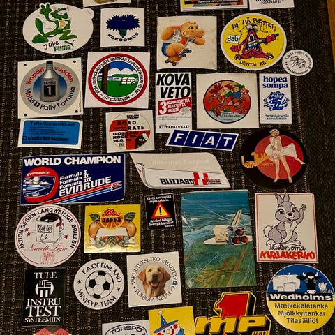 Kokoelma 5 erilaisia tarroja 70- ja 80-luvuilta.