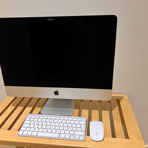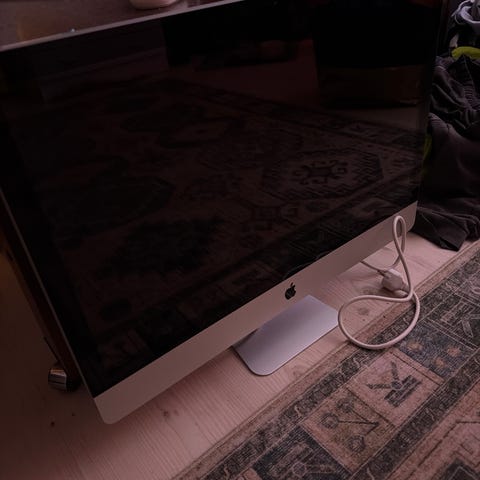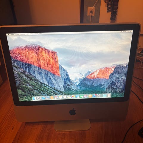 Apple iMac pöytätietokone, jossa on näkyvä näyttövaurio näytön yläosassa. Laite sisältää useita USB-portteja ja verkkoliitännän. Käyttöjärjestelmä ja tekniset tiedot näkyvät näytöllä kuvissa. Tietokone toimii vaikka on vauurio näytössä. Näppäimistö ja hiiri ei kuulu kauppaan.