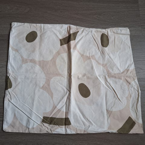 Myydään Marimekon Unikko tyynyliina. Väri hieman tummunut ja pari tahraa/värjäymää. Koko 50cm x 60cm.