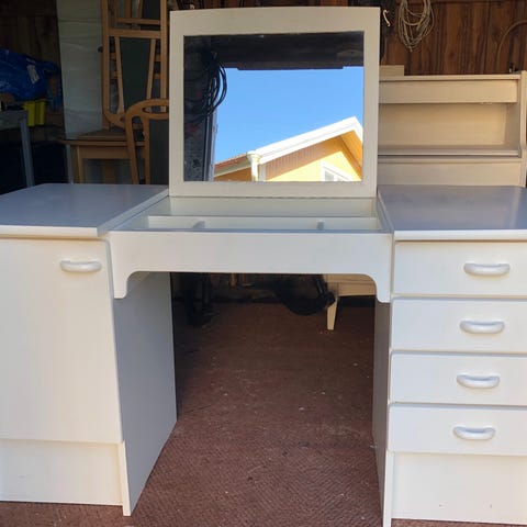 Tyyliltään klassinen ja toimiva kokonaisuus, sopii esimerkiksi makuuhuoneeseen tai meikkauspisteeksi. Pöydässä ja laatikoiden sisällä näkyvää käytön jälkeä. Nouto Rekola