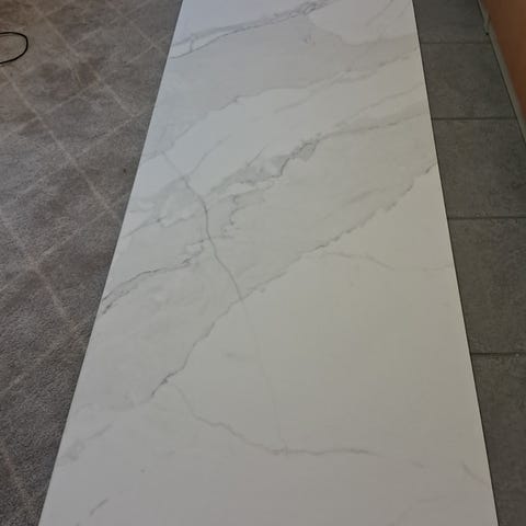 Upea marmoritaso sekä Ikean jalat. Taso lepää jalkojen päällä. Meillä toiminut työpöytänä, aiemmalla omistajalla ruokapöytänä. Tasossa normaalia kulumaa, esim juomalaseista jäänyt hentoja värittömiä jälkiä jotka näkyvät lähinnä heijastaessa. Reunassa pieni roso (kuva). Tason alapuolella värjääntymiä, jotka eivät näy normaalikäytössä, ellei istu pöydän alla.
