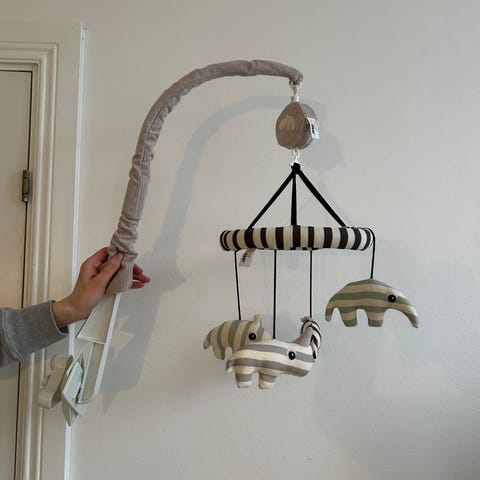 Done by Deer mobile, jossa on raidalliset pehmolelut. Mobile kiinnitetään sängyn reunaan.