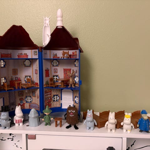Pieni avattava muumitalo (kork 31cm). Mukana kuvassa näkyvät huonekalut ja neljä hahmoa.
