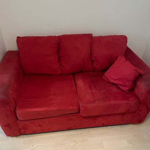 Kahden istuttava (Finsoffat) punainen sohva. Korkeus noin 60cm, istuinosan leveys 120cm ja sohvan yhteisleveys 180cm.